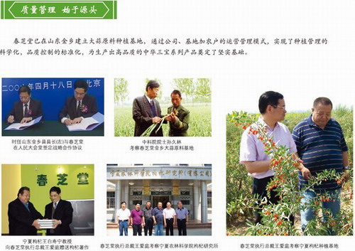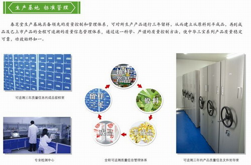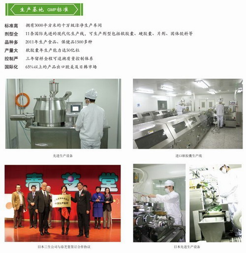 春芝堂公司目前在上海闵行拥有国际一流的生产基地,拥有国家GMP认证、QS认证、国家出口食品卫生注册证书、美国FDA资格证书、国际ISO22000、英国BRC和欧洲HACCP、欧盟涉水产品认证、等八大权威认证。65%以上产品进入欧美日韩等30多个国家和地区,标志着春芝堂产品已达国际一流水平。 目前,已建成宁夏枸杞原料基地、山东金乡大蒜原料基地,实现了从原料到成品的“全程可追溯式质量控制”。2012年,春芝堂建成中国唯一、世界第六的植物软胶囊生产线,这标志着春芝堂将成为中国植物软胶囊国家标准的制定者。