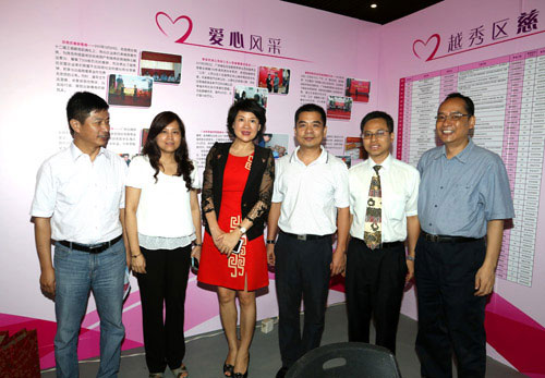 胡静理事长与领导在越秀区慈善推介展位里合影