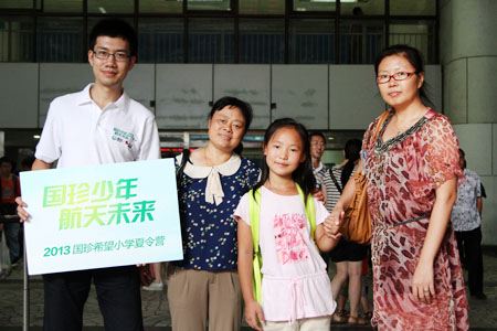 8月12日,对于湖南省桑植县芭茅溪乡国珍希望小学的四年级学生莫蕊来说是一个难忘的日子。这一天,她生平第一次随着老师走出大山,乘坐高铁来到首都北京。自从接到参加“国珍少年 航天未来”夏令营活动的通知以来,小莫蕊不止一次憧憬着首都北京,向往着精彩的“外面的世界”。然而当抵达北京的那一刻,小莫蕊脑海中浮现的不再是从电视中了解到的关于北京的点滴记忆,取而代之的是溢于言表的兴奋和难以掩饰的激动。图为小莫蕊及老师在北京西站与前来迎接她们的工作人员合影留念。