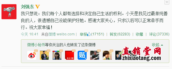 针对这些屌丝的吐槽,刘强东于今日下午16:41时终于在微博上做出了回应:“我只想说:我们每个人都有选择和决定自己生活的权利。小天是我见过最单纯善良的人,很遗憾自己没能保护好她。感谢大家关心,只求以后可以正常牵手而行。祝大家幸福!”