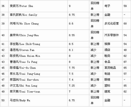 - 2013福布斯台湾富豪榜前50名 陈得福新上榜