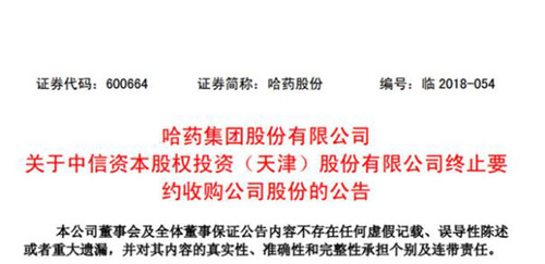鉴于以上情况,中信资本医药依据《关于哈药集团有限公司之增资协议》对哈药集团的本次增资已无法继续进行。