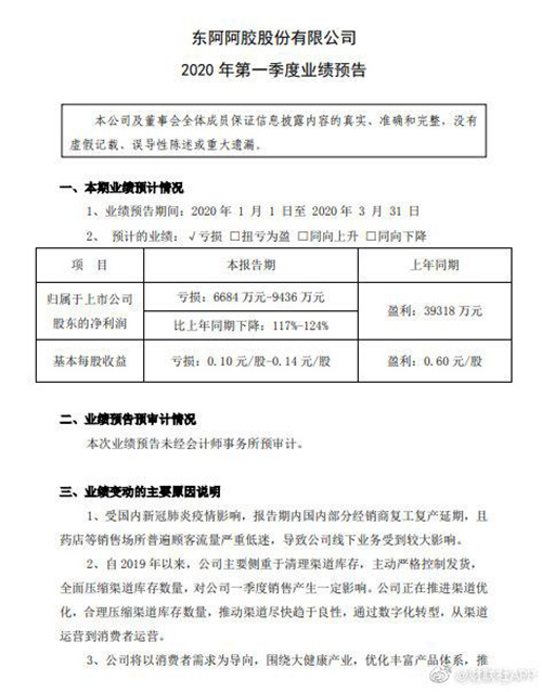 东阿阿胶2020年第一季度业绩预告,归属于上市公司股东的净利润亏损6684万元-9436万元,上年同期盈利3.93亿元。受国内新冠肺炎疫情影响,报告期内国内部分经销商复工复产延期,且药店等销售场所普遍顾客流量严重低迷,导致公司线下业务受到较大影响。