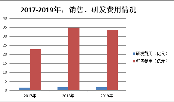 同时,2017-2019年,公司销售费用占营业收入比例却大幅增长,分别为43.14%、50.42%、49.64%。