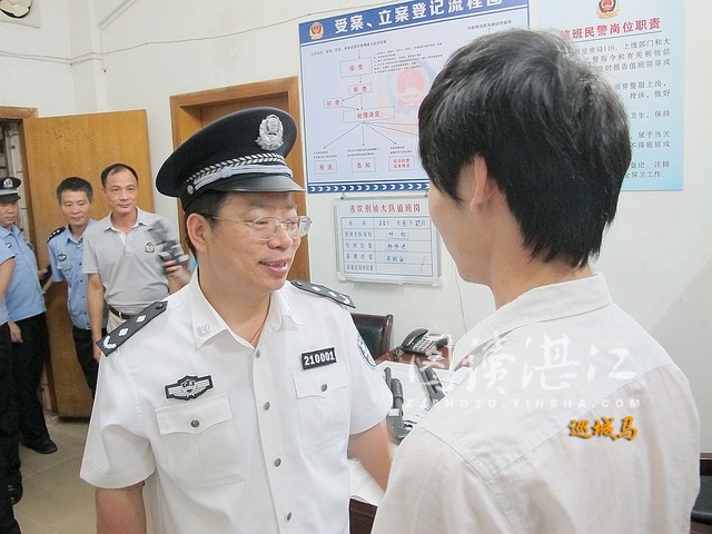 碧海银沙网讯(图文/特约摄影师 马志军 通讯员 湛公宣 编辑/金 臻 蔚 青)6月27日夜里,“巡城马”随有关方面跟踪采访市公安部门开展“安港”(平安港城)行动到了赤坎公安分局刑警大队时,意外见到了这么一个感人的场景:一名正在屋内接受媒体采访讲普通话的小伙子看到湛江市常务副市长、市公安局局长张荣辉进来时,立刻迎上去握着张荣辉的手有点儿腼腆但难以掩饰感激之情地连连说到:“谢谢你张市长!”“市长你放心,我不会再做传销了……”