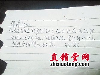 “帮我打110,我被搞进传销里面了,现在住在劳动路公园山56号旁边,门是蓝色的,里面有10个人,帮我交给警方,救我。谢谢。”不过,字条没有落款和日期。