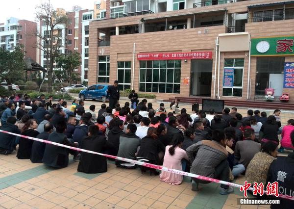 11月5日,广西北海市打击传销办公室执法人员在该市广东路的一个住宅小区查获近百名涉嫌传销人员。据悉,旅游城市北海从今年8月11日起开展代号为“封城”的打击传销行动,严打涉传“一日游”和涉传“看房团”,一批重点涉嫌传销人员、旅行社、“黑导游”和“讲师”相继被查获。图为一批涉嫌传销者在北海市广东路的一个住宅小区接受警方教育。