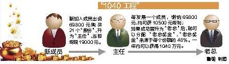 “1040工程”单从字面上看会给人极大的神秘感,其实这个数字就是蛊惑人心的那个环节———1040万元钱。该组织的诱人之处就在于,组织者会建议刚加入的成员直接购买21个“股份”共计69800元,不仅可以直接升任为“主任”,而且当即就能返现金19000元;成为正式“股东”后,每发展一个成员都有返利(提成),发展成员越多所拿返利(提成)越多,如果成功晋升为“老总”后,就可以分配“老总奖金”,“老总奖金”来源于每个份额的48%,其下线每发展一个成员(缴纳69800元),均可获得10500元的返利,一直领到第三代下线会员达到老总级别为止,此时第一代成员自动出局,要想再进入组织就要从头开始。