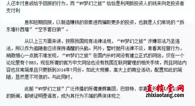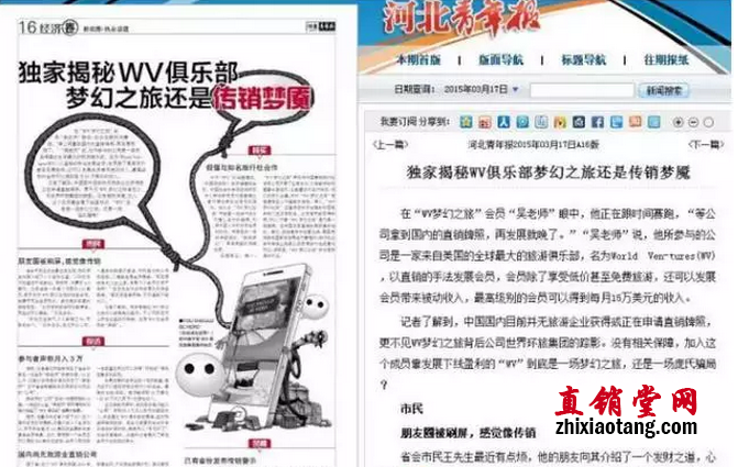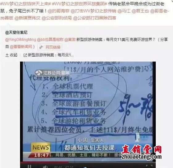 3月10日,江西省旅游质量监督管理所就发布了特别警示称:最近全国旅游质监系统通过监控发现,有个名为“WV梦幻之旅”的涉嫌传销的组织在全国各大城市渗透。据查,该组织以所谓美国公司的背景,在并未取得我国旅游经营许可,也没有向任何部门申请直销牌照的情况下,通过入会费、拉人头、层层分红等金字塔营销模式发展会员,不仅严重扰乱旅游市场正常的经营秩序,而且涉嫌网络传销诈骗,给社会稳定带来不利影响,请广大旅游消费者切勿陷入传销陷阱。