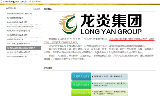 打开看到的仿佛是一个“正规”的大集团网站,里面介绍“龙炎集团”母公司杭州龙炎电子商务有限公司成立于2015年4月,注册资本1000万元人民币。