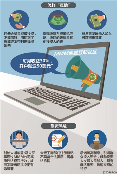 今年1月,北京青年报曾报道了《四部委联合预警 “金融互助”成理财新雷区》,其中介绍了MMM金融互助社区等网络投资平台,打着“金融互助”的旗号,却以非法集资、传销的模式运行。对此,银监会、工业和信息化部、人民银行和工商总局已发出提示称这种投资方式扰乱金融市场秩序,损害社会公众利益,具有极大风险隐患。