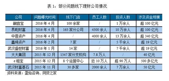 出事的“传销化”线下理财机构,通常涉及资金规模大,参与人数多。如表1所示,近期出现问题的几家线下理财公司中,涉及资金少则几十亿,多则上百亿。由于公司设定的“裂变”规则需要大量人员的不断加入,问题线下理财公司涉及的人数大多在万人以上,并且在某些区域有大量的线下门店。这些线下理财公司的倒闭,不仅使大量投资者遭受大额损失,还会对金融体系及区域社会稳定,产生严重的负面影响。