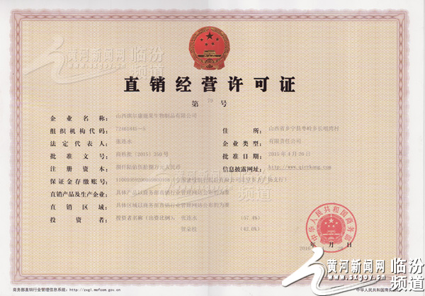 近日,国家商务部向山西琪尔康翅果生物制品有限公司颁发了“直销经营许可证”。这是我国颁发的第79个直销牌照,在我省是首家,也是目前仅有的一家荣获直销经营许可证的企业。这标志着山西琪尔康翅果生物制品有限公司进军直销行列,同时也填补了我省企业无直销经营许可证的空白。