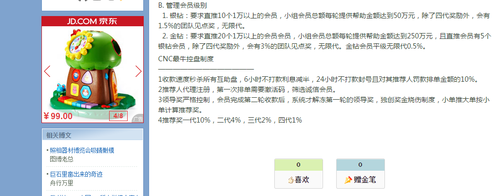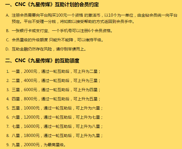 而且,网上宣称“CNC互助金融平台相比MMM也有更惊爆眼球的收益,运营模式和金融体系也更加完善。在九星互助传媒的互助额度为2000—20000元,一共分为九星,每位会员每天都将得到每天2%的互助金。每逢双日,会员有两次获得点击抽奖的机会,每次1000元的奖励。每经历一轮互助后,级别就会上升一星”。