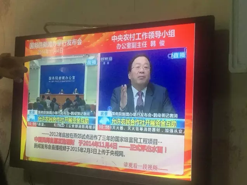 次日,需要“领悟”的内容变得更多。在“专讲法制”的一堂课上,西装革履的中年男子播放了一段打着中央电视台台标的视频,然后像播音员那样字正腔圆地宣称,“2014年11月4日”,中央农村工作领导小组办公室一位副主任,“让新型合作金融这一国家级富民项目正式浮出水面。其中所说的‘民间自发’‘限制在社区内部’,正是点名表扬了咱们模式。”