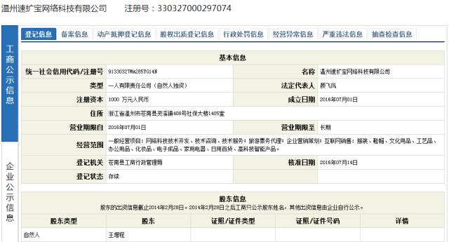 第一直销网查询发现,温州速扩宝网络科技有限公司成立于2016年7月1日,法人代表为颜飞凤,股东为王增程。