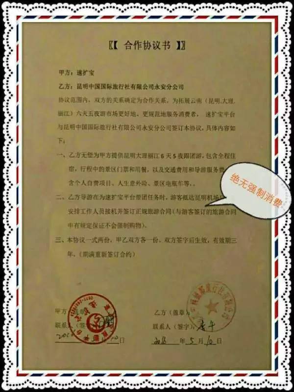 据速扩宝宣传资料显示,2016年5月10号速扩宝与昆明中国国际旅行社有限公司永安分公司签下3年合同。