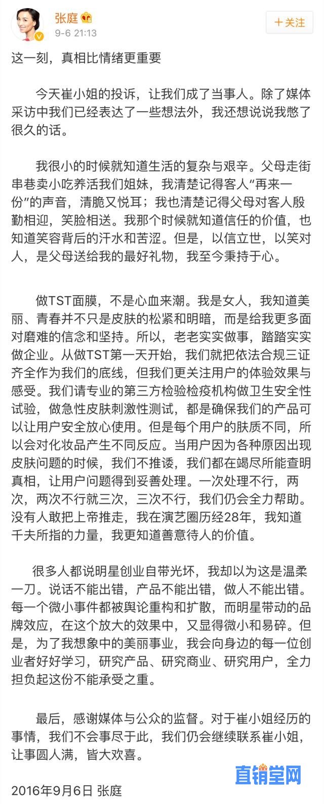 昨晚,张庭在微博上对崔小姐一事进行了首度回应,内容太长,总结起来就是: