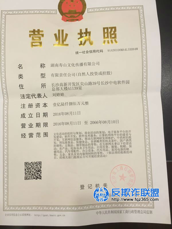 湖南寿山文化传播有限公司登记的住址在长沙高新开发区内,公司成立于2016年8月11日,公司注册登记经营项目为文化活动的组织与策划、商业活动的策划、电子商务平台的开发建设、互联网信息服务、中药材的批发、预包装食品、保健食品、非酒精类饮料及茶叶、国产酒类的销售等,同时注册登记在互联网从事的经营活动有:农产品、化妆品及卫生用品、日用一货、服装、鞋帽、保健用品、汽车零配件、办公设备、家用电器的销售;五金、家具及室内装饰材料的零售等。