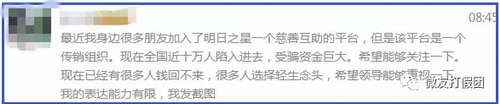 这是前几天,微友发给小编的来信,称身边很多人都加入了这个【明日之星】互助理财,一个接着拉一个,现在看清这平台真面目,就是非法集资、传销性质的骗局。很多人投入了所有积蓄,得知遭遇骗局,内心无法接受,甚至微友表示朋友轻生念头都有了。