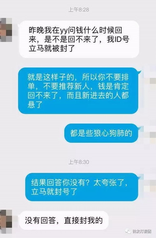 一参与【明日之星】互助理财投资聊天中吐槽到,看到近期出现的各种问题内心不安就问了下“钱什么时候回来?是不是回不来了?”立即ID被封号。这一向都是骗纸做派,只需讲假话不能说真话,对于这些 有理有据的事实,智商根本不够用无法解答这问题,最老的办法就是封,拉黑。
