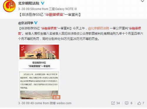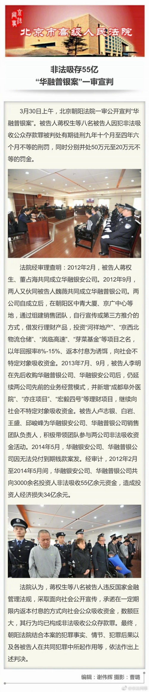 3月30日上午,北京朝阳法院一审公开宣判“华融普银案”。被告人蒋权生等8名被告人因犯非法吸收公众存款罪被判处有期徒刑9年10个月至4年6个月不等的刑罚,同时分别处50万元至20万元不等的罚金。