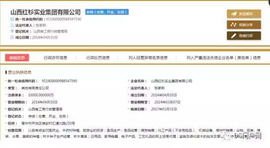 资料显示山西红杉实业集团有限公司前身为红杉药业,于2000年在山西省晋中市榆次区成立。集团现由一个本部(榆次),三个总部(北京、深圳、美国圣地亚哥)组成。是一家以现代生物工程技术应用为核心,集红豆杉、金花葵人工种植和紫杉醇、总黄酮提取加工及医药保健品的研发、生产、经营于一体的高新科技企业。 公司成立于2014年04月10日,注册资本:10000.000000万,法定代表人:张家跃。