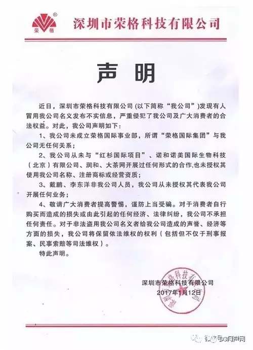 2016年深圳荣格科技有限公司的纠纷案闹得沸沸扬扬,深圳法院于2016年12月份裁定, 禁止孙会喜行使股东权利。工商系统正式撤销孙会喜于2016年5月19日任深圳市荣格科技有限公司法人的资格,包括在其后变更的一系列董事成员,高管人员,监视成员的变更均被撤销。孙小玲法人资格得到确认。因此与红杉国际合作的荣格公司为假冒的。2017年1月12日,深圳市荣格科技有限公司官网对有人冒充公司名义发布不实信息一事发布了官方声明。