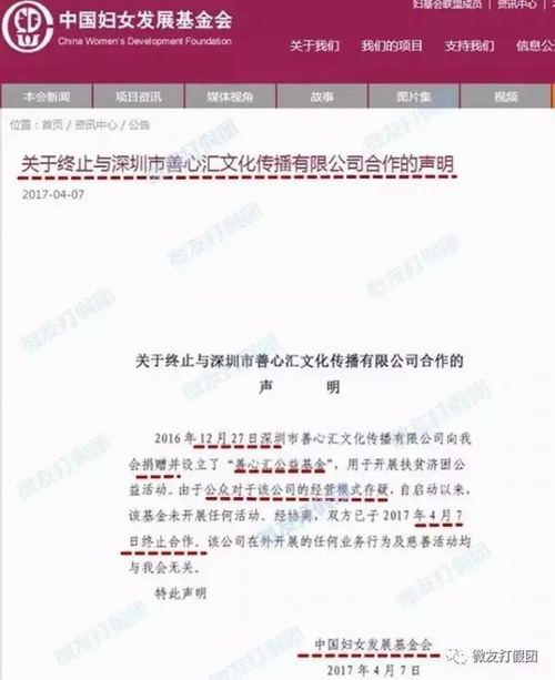 重磅消息,“中国妇女发展基金会” 在官网发文声明,因对「善心汇」经营模式存在质疑担忧,且合作以来「善心汇」设立的“善心汇公益基金” 并未开展任何活动,所以终止合作,从起划清界限。