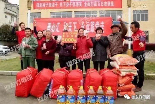 「善心汇」凭借着这把尚方宝剑,渗透农村各个角落,以 “爱心、致富、扶贫” 等口号攻城猎地,所到之处总是排满着中老年人等着领油米、红包等小恩小惠,「善心汇」迅速俘获了这些底层穷人的信任。