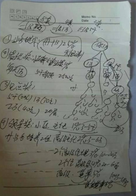 接着,记者想进一步的了解如何报单及受益时,吴主任便拿着一张白纸和笔边说边画起了发展下线的分析图案,并称“一级代理是一万,往下发展两人,只要复制两人你就可以挣五千元,如果是二级代理就是两万,往下复制两人就可以挣一万元,也就是绩优奖,其实就是A区、B区碰在一起往下发展,都是双轨制,复制的人多了,你什么不用干,就等着挣钱就行了,因为老师也会帮你的”。当记者表明先带回这张画着制度的图纸回去考虑后再联系,吴主任显然不太高兴但还是遵从了记者的请求。