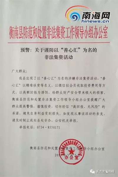 5月2日,湖南省衡阳市衡南县防范和处置非法集资工作领导小组办公室也发布了《预警:关于谨防以“善心汇”为名的非法集资活动》,提醒群众注意防范。