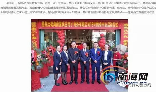 记者还获悉,善心汇在三亚市还设立了海南慧尚品电子有限公司19号商务中心。(善心汇官网相关内容报道:http://www.shanxinhui.cc/newsdetail/251736.html)该中心自称是全国创新会员制包销互联网商城,通过建立网络销售渠道和优化资金周转收益,从根本上解决企业商家生存发展的库存和资金难题。但记者点击该网址,腾讯电脑管家提示:“危险网站 千万不要访问”。查询“为什么危险”?显示为:“危险 - 您要访问的网站包含欺诈信息” 。