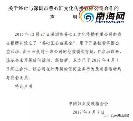 中国妇女发展基金会发表声明称,由于公众对该公司的经营模式存疑,该会与善心汇终止合作。