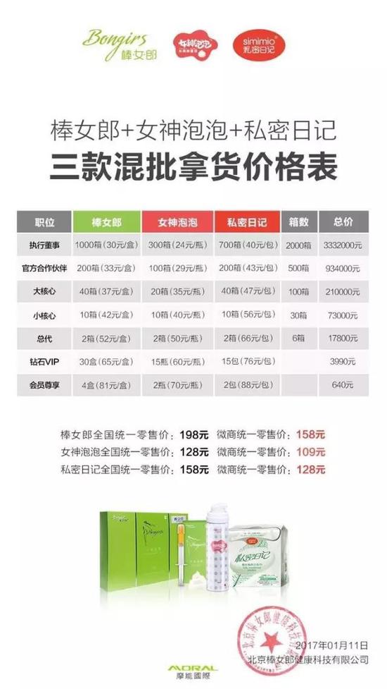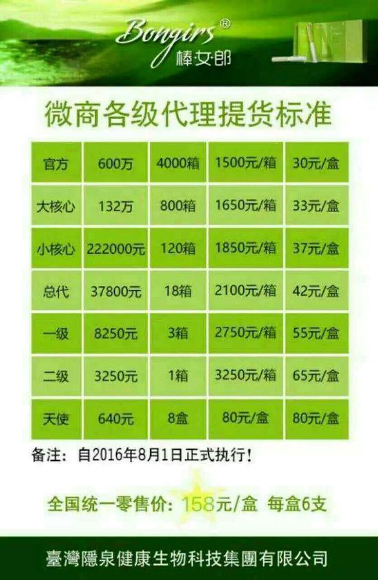 以棒女郎为例,根据2016年8月涨价后的标准,要成为“官方”级别的代理,需交600万,每盒仅30元;入门级别“天使”,需交640元,每盒80元。