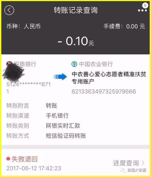 6月12日上午,网友“横刀立马惟我”安排专人去按照上图“中农善心爱心志愿者精准扶贫专用账户”和银行账号6213363497325979666存款,结果竟然转帐失败。详见下图↓↓↓