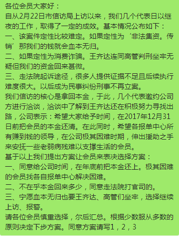 3月8日如期而至,相关部门也给出了答复,根据几位代表整理出的解决方案,水土爱沐大部分会员还是选择相信公司,给公司时间,期望在2017年12月31日能够拿回本金。