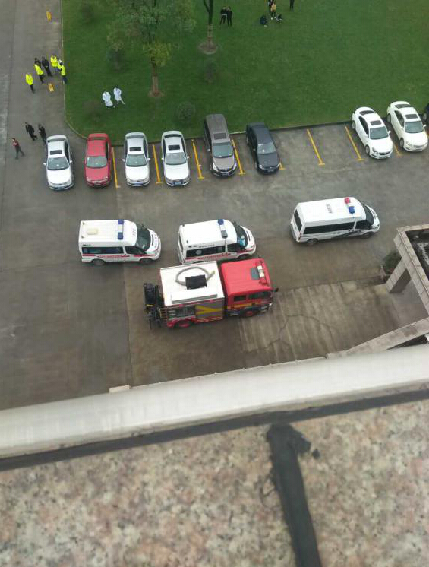受害人被逼无奈准备跳楼,现场警车、救护车已到达