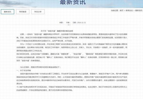 创造丰盛方面,则在其官网刊出说明,否认层层返利、传销、诈骗的指控,称课程都是明码标价,加盟培训中心的“合作推广者”理应自负盈亏。在官网的“联系我们”页面,则仅剩下创造丰盛在海外的场所、电话,国内的联系方式却一无所有。