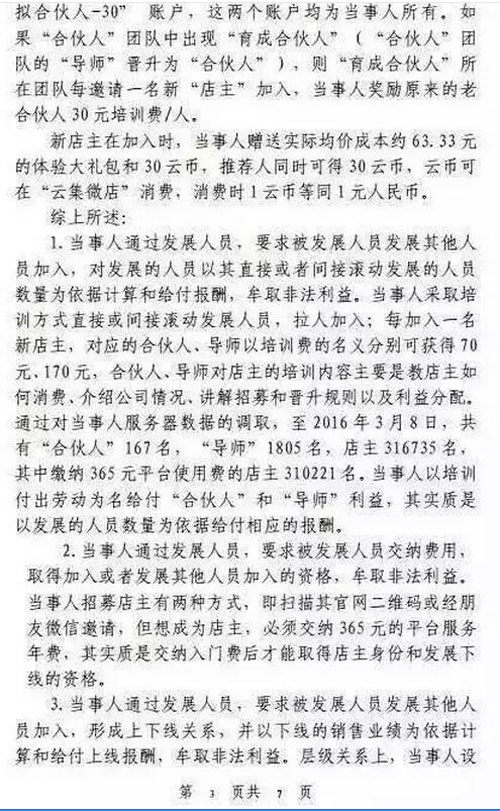 1、云集微店通过发展人员,要求被发展人员发展其他人员加入,对发展的人员以其直接或者间接滚动发展的人员数量为依据,计算和给付报酬,谋取非法利益。云集微店采取培训方式直接或者间接滚动发展人员,拉人加入;每加入一名新店主,对应的合伙人、导师对店主以培训费的名义分别可获得70元、170元,合伙人、导师对店主的培训内容主要是教店主如何消费、介绍公司情况、讲解招募和晋升规则以及利益分配。