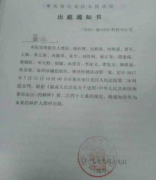 7月19日,从重庆市江北区法院获悉,重庆快联涉嫌组织领导传销活动案将于7月21日上午10时宣判。