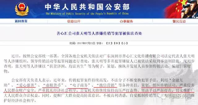 近日,公安部统一部署依法对深圳市善心汇文化传播有限公司法定代表人张天明等人涉嫌组织、领导传销活动犯罪问题进行查处,张天明等多名犯罪嫌疑人已被依法采取强制措施。