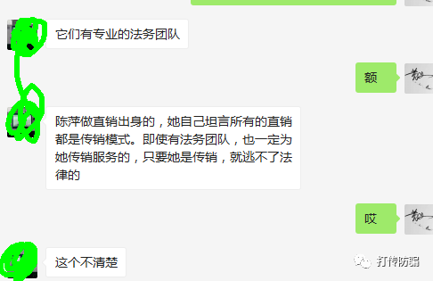 根据受害者提供说:陈萍做直销出身的,她自己坦言所有的直销都是传销模式。即使有法务团队,也一定为她传销服务的,只要她是传销,就逃不了法律的