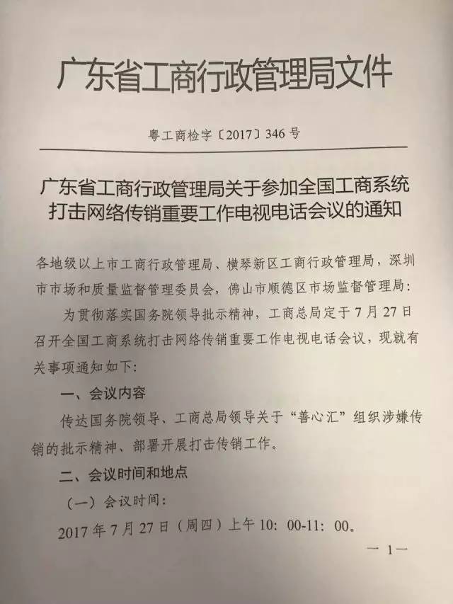 另据广东省工商管理局之前发出的《广东省工商行政管理局关于参加全国工商系统打击网络传销重要工作电视电话会议的通知》文件显示,本次会议内容为“传达国务院领导、工商总局领导关于‘善心汇’组织涉嫌传销的批示精神、部署开展打击传销工作”。
