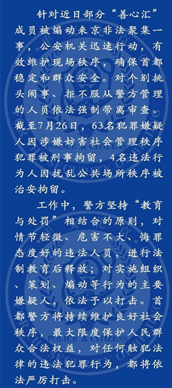 据北京警方近日通报,针对近日部分“善心汇”成员被煽动来京非法聚集一事,公安机关迅速行动,有效维护现场秩序,确保首都稳定和群众安全。对个别挑头闹事、拒不服从警方管理的人员依法强制带离审查。截至7月26日,63名犯罪嫌疑人因涉嫌妨害社会管理秩序犯罪被刑事拘留,4名违法行为人因扰乱公共场所秩序被治安拘留。