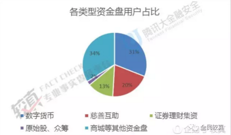 腾讯大金融安全的数据显示,市场上用户数最多的资金盘为商城等其他资金盘,占比34%;其次为数字货币,占比31%;第三是慈善互助,用户数占比20%。