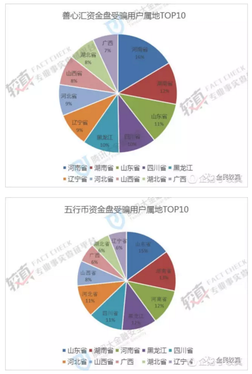 善心汇受骗用户主要集中在河南(16%),湖南(12%),山东(11%),五行币受骗用户主要集中在山东(15%),湖南(13%),河南(12%)。说明中部、北部地区是五行币、善心汇受骗用户重灾区。