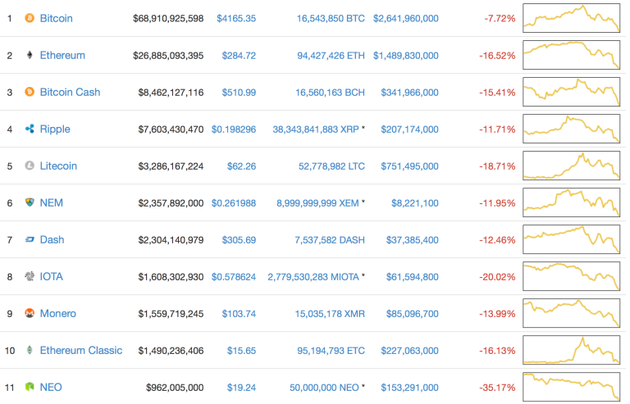 在连续几个月的上涨之后,几乎所有数字加密货币的价格都在过去48小时内出现了两位数的跌幅。通过Coinmarketcap.com可以看到所有这些数字加密货币的行情。其中,比特币过去几天价格下跌了16.5%,而以太坊下跌了23.5%。