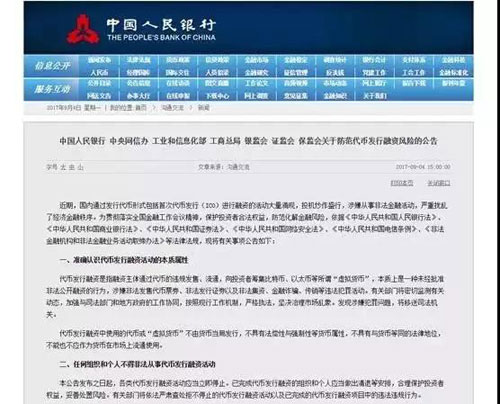 这一天,央行等七部委叫停了ICO:在中国,所有代币发行融资要马上停止。