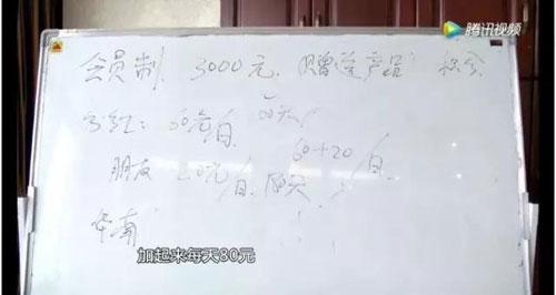 在讲课的黑板上可以看到:所谓的会员制度,投资3000元成为会员,赠送产品并获得积分。每个工作日享受60元的分红,共返利100天。分享一个朋友获得20元每个工作日的返利,共返利180天。